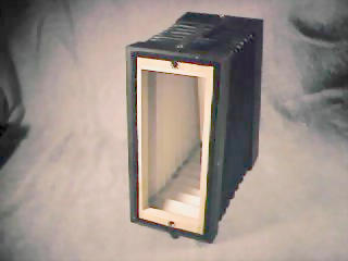 The reads were salvaged from an old button box purchased at a yard sale. There are actually two sets of musette tuned reeds. Musette tuning is accomplished by cutting both sets of reeds to the same notes (unison). Because the reed pairs can never be tuned exactly the same, a rich 'chorused' effect results. Alternatively, a cajun accordion would add an extra reed bany one octave above the musette pair and another an octave below, giving a total of 4 reed sets (or banks). A cajun accordion also provides a set of 4 controls (stops) to selectively turn each reed bank on or off.