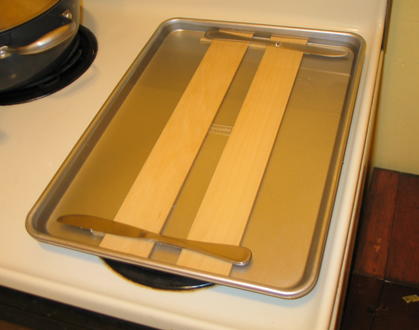 The wood was steamed (actually boiled) in a heavy-duty baking pan for about half an hour. The sides are raised off the bottom of the pan by 2 small pieces of wood and weighted with 2 table knives.