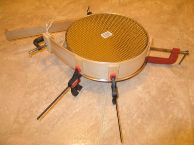 In conventional guitar building, a pair of molds are used to form the steamed sides. I decided to use a cake pan as the mold. While this saved time, it was quite difficult to get the shape just right to match the top and back. In hindsight, I would build a set of proper molds if I decided to build another guitar.