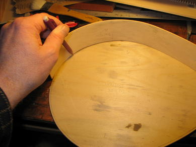 In another departure from traditional guitar building techniques, I decided to glue the kerfing to the top and back rather than the sides. The kerfing is a slotted strip of wood that is glued at the seam between the top (or back) and the sides of the guitar to create greater bonding area and therefore a stronger body. Here I am transferring the shape of the sides to the back of the guitar as a guide for the kerfing. Note the stains in the wood .... further proof that the guitar was made from "available" wood.