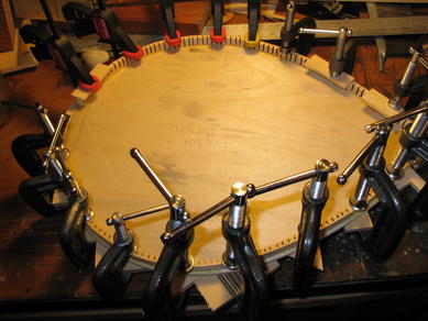 In yet another huge departure from tradition, the sides were bonded to the back using a rather complex clamping arrangement. Each screw acted as a single clamp. To protect the sides and provide greater clamp contact area, I used a piece of wood a some brass stock between the screw ends and the guitar body. This technique worked very well.