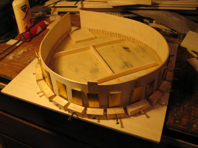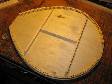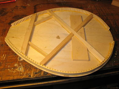 The top was braced using a conventional X-brace pattern. The rectangular piece of wood (actually 3 separate pieces) is called a bridge plate and provides a secure foundation for the bridge. The bracing was made heavier than was probably required but once again, strength was the key concern.