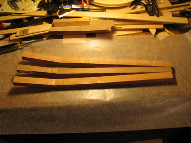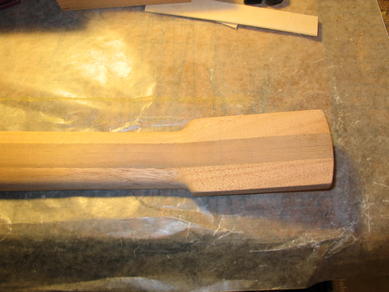 For the neck construction, I began by rough cutting 3 pieces of wood to the desired profile. The middle piece is maple and the 2 outer pieces, mahogony. Once the body of the guitar was finished ... (and turned out better than I thought it might), I decided to purchase the wood for the nech and fretboard.