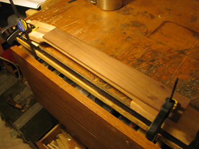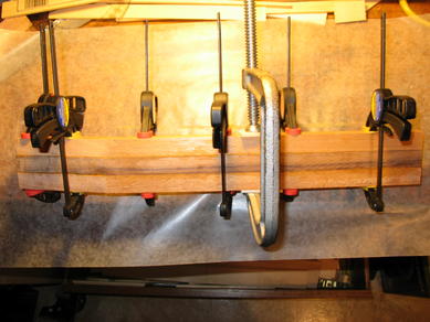 Here the 3 pieces forming the nech are glued and clamped. I used standard Carpenter's wood glue for the task.