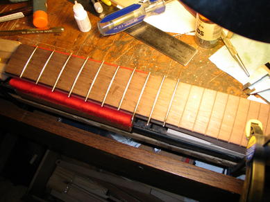 A fret saw was used to cut the slots and a small mallet and fret setter were used to set the frets. There are many ways to set frets but this was the simplest. The frets were pre-bent to fit the radius and trimmed and filed.