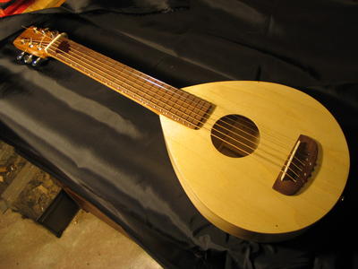 The completed guitar turned out quite well. The body was finished using urethane varnish as was the neck (at the headstock and heel). The backside of the neck was oiled to prevent the friction often associated with urethaned neck. The sound is pretty good for such a small sized guitar and most importantly, it sounds balanced. All of the strings sound like they "belong" to the same instrument and there are no dead spots or booming notes.